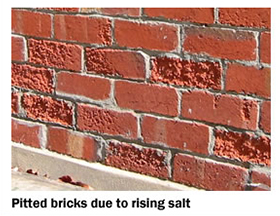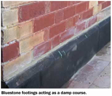 Most brick homes will eventually get Rising Salt Damp or Rising Damp as it is more commonly known. Most brick structures are built with a damp course. These days the first ten courses {approx}of mortar in a brick wall have damp course chemicals or waterproofer added to the mortar. These don’t necessarily stop salt though.100 years ago a course of slate may have been used or bluestone footings may have been relied upon to stop the damp as bluestone is not as porous as bricks. From the 1920’s until the 1950’s a bitumen course was the preferred option. These earlier methods worked well for many years but eventually they break down. 60 to 100 years is not a bad effort but damp courses need maintenance eventually.